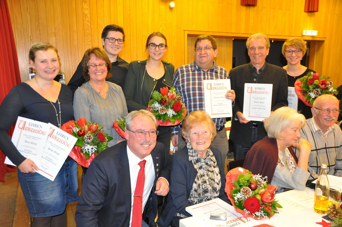 Mitgliederehrung beim TuS Honau: der Vorsitzende Thomas Epple mit Hedwig Thumm (vorn sitzend, von links), dahinter Anja Glück (von links), Karin Strycek, Tobias Goller, Sarah Speidel, Thomas Rieger, Walter Saur und Michaela Frech. FOTO: BIMEK