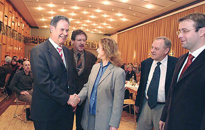 Warmer Händedruck für Gerhard Stratthaus. Margarete Krug freute sich mit Dieter Hillebrand (im Hintergrund), Rainer Ullrich und Florian Weller über den prominenten Gast aus Stuttgart.