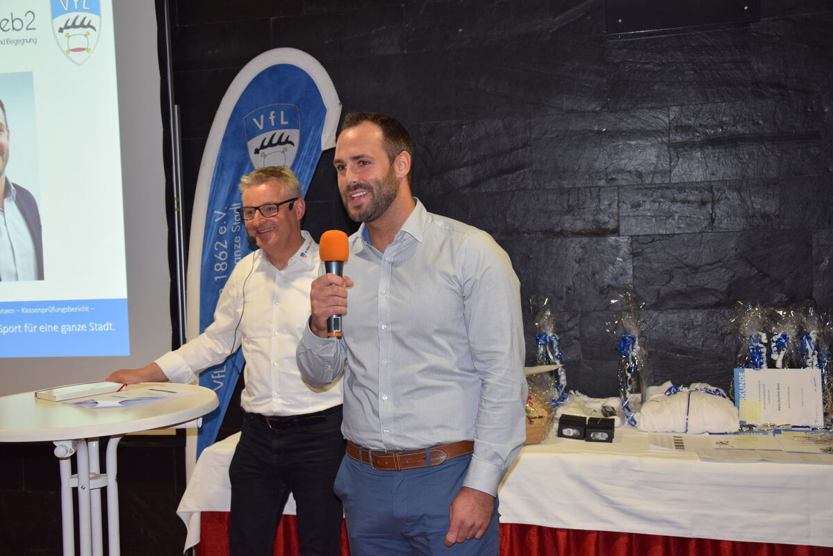 Der neue Hoffnungsträger des Sportvereinszentrums peb2: Benjamin Baur (rechts) hat vor einer Woche den Job des Geschäftsführers übernommen. Hier ist er mit VfL-Präsident Sven Schauenburg zu sehen, als er sich in der Hauptversammlung des größten Pfullinger Vereins den Mitgliedern vorstellte. FOTO: SCHÖBEL