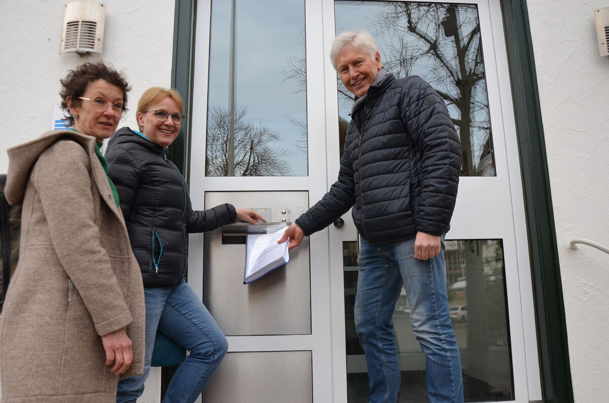 1 757 Unterschriften für den Verbleib des Bäderchefs haben Susanne Blum (von links), Gaby Frey-Bantle und Gert Klaiber am Donnerstagnachmittag in den Rathaus-Briefkasten geworfen.