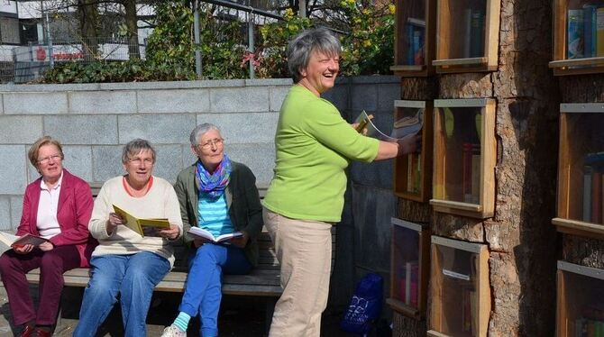 Eine Gruppe von Bücherfreundinnen der Pfullinger Mentorenwerkstatt kümmert sich regelmäßig um den Bestand im Bücherbaum auf dem Marktplatz (von links): Gunhild Auer, Eva-Maria Gümbel, Monika Tischer und Annette Herrmann. Beim Pressetermin nicht dabei sein konnten Waltraud Jeurissen und Karin Seelhorst.