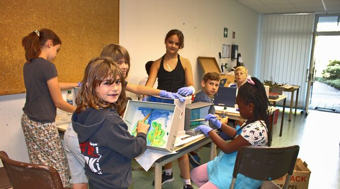 Zum Abschluss der Talentcampus-Woche bei der VHS Pfullingen durften alle Kinder ganz entspannt noch einmal Pfullinger Sagenlandschaften malen und kleben.