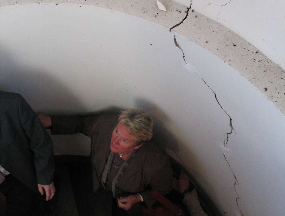 Risse im Turm der Pfullinger Hallen: Der Pfullinger Gemeinderat machte sich ein Bild von den Schäden am Gebäude. Ursache dafür sind die faulenden Gründungspfähle, die das Gewicht des Gebäudes nicht mehr aufnehmen können.