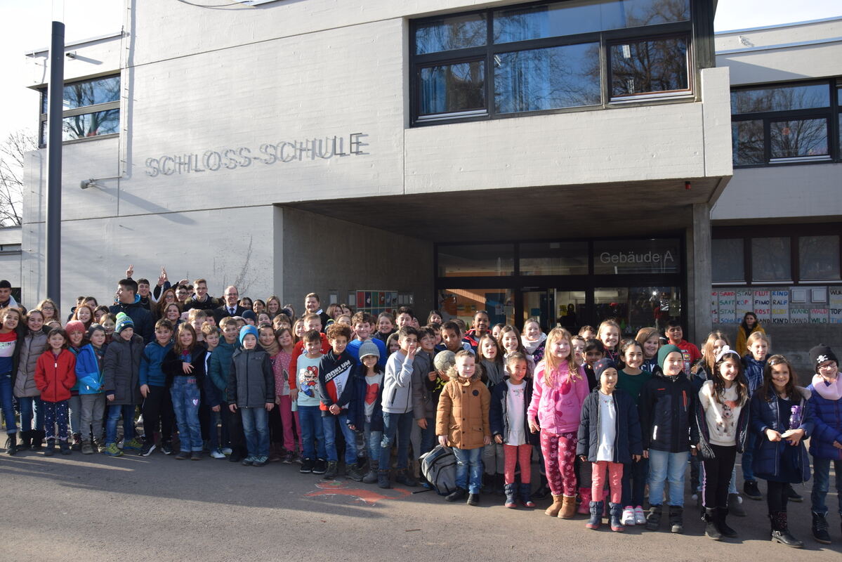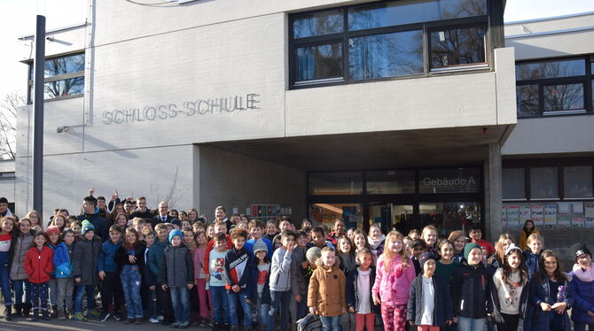 Die Pfullinger Schloss-Schule ist jetzt unverwechselbar: Vor Kurzem ist am Gebäude A ein Schriftzug mit ihrem Namen angebracht worden. Gestern haben Bürgermeister Michael Schrenk und Hauptamtsleiterin Katja Anton-Kalbfell die neue Signatur offiziell der Schule übergeben. Fürs Foto hatten Schulleiterin Sabrina Sandhu und Konrektorin Miriam Grell flugs die Kinder der dritten und vierten Klassen zusammengetrommelt. Der Schriftzug im Metall-Design ist das Geschenk der Stadt an die Schloss-Schule, die im vergangenen Jahr 50-jähriges Bestehen gefeiert hat. Vor Jahren war der Name der Schule schon einmal weithin sichtbar zu lesen: Mit Klebestreifen waren die Buchstaben in den oberen Fenstern befestigt. Sie sind aber schon lang verschwunden. Jetzt freut sich die Schulleiterin, dass die Stadt dem Wunsch der Schule nachgekommen ist und die Edelstahl-Lettern spendiert hat. »Das ist ein schöner, schlichter Schriftzug«, betont sie, »und es hat uns riesig gefreut, dass er so schnell angebracht worden ist.« (ps)