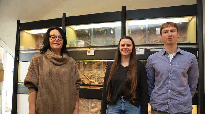 Sie suchen Paten für die Zwinger: Rebecca Müller (Mitte) und Michael Stych von der Hochschule Reutlingen realisieren den Infotag organisatorisch. BMT-Geschäftsführerin Heidi Riekert unterstützt die Studierenden. In der Mitte schaut Kevin, die Bartagame, zu. FOTO: REISNER