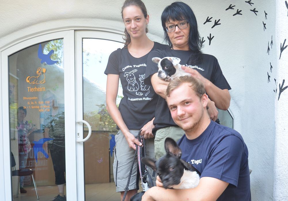 Sie haben ein Herz für Tiere in Not: die Mitarbeiter des bmt-Tierschutzzentrums Alina Schneider (von links) mit dem Dackel Aki und der Hündin Melly (die sich in der Mitte versteckt), Heidi Rieker mit der noch jungen Französischen Bulldogge Emmi und Dennis Müller mit deren Bruder Charly.