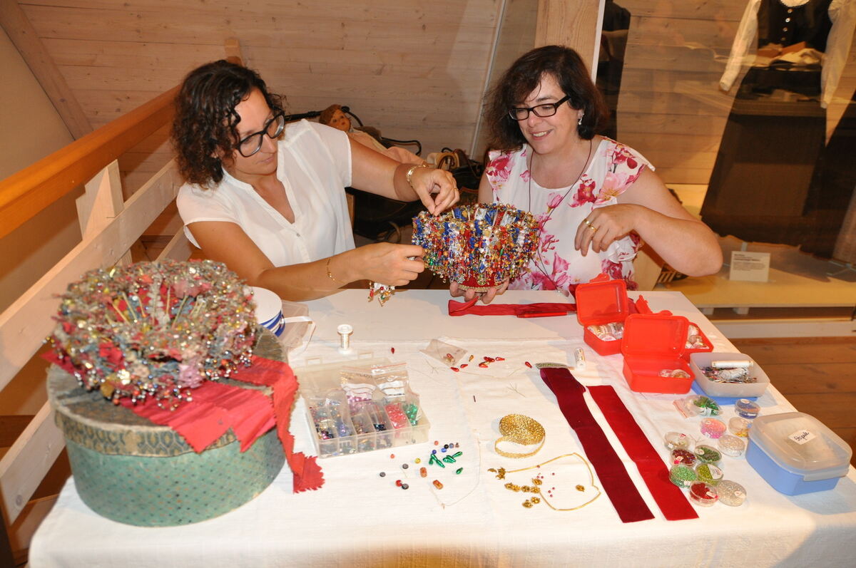 Kathrin Kaiser (links) und Rosetta Akermann zeigten im Pfullinger Trachtenmuseum, wie Schapeln hergestellt werden. Im Vordergrund eine Schapel aus der Mitte des 19. Jahrhundert.