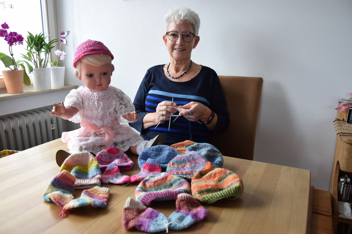 Die Puppe Inge trägt noch ein gehäkeltes Sommer-Käppchen, während Roswitha Zeeb bereits weitere Mützchen und Söckchen in der Winter-Version für die Entbindungsstation des Reutlinger Krankenhauses strickt. foto: schöbel
