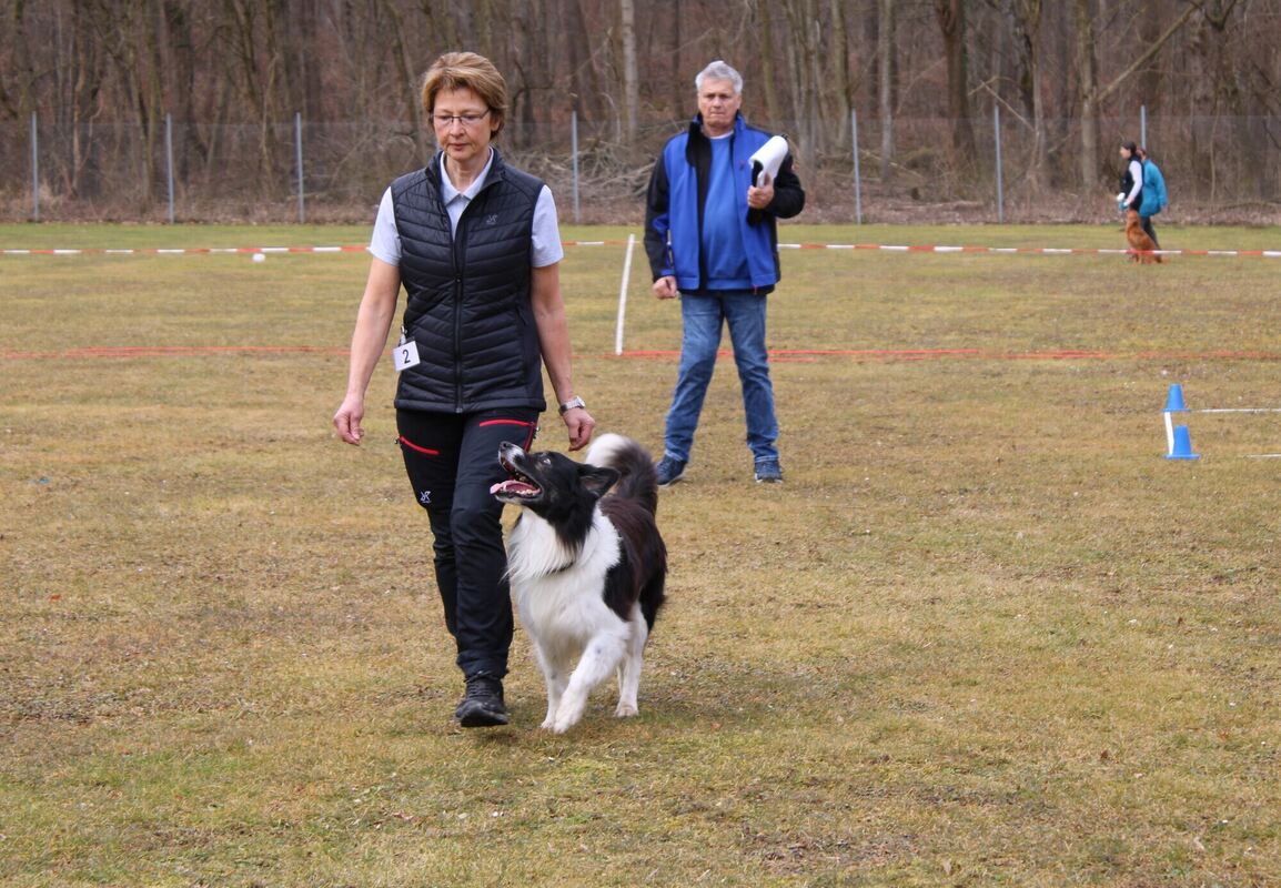Hohe Konzentration herrscht bei der Hundebesitzerin und ihrem aufmerksamen Border Collie, der genau bei Fuß gehen muss. Der Preisrichter beobachtet die korrekte Ausführung.