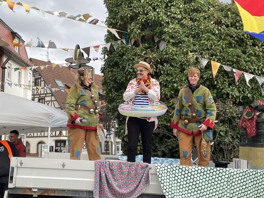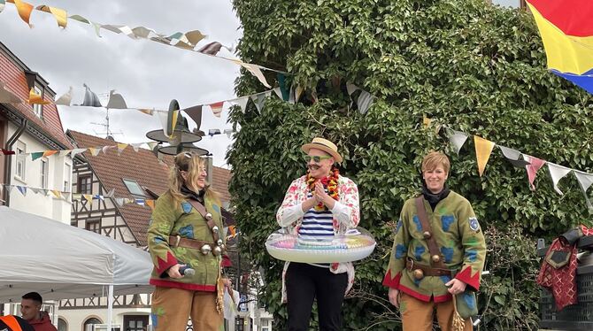 Weil das Freibad-Personal im vergangenen Jahr sehr knapp war und das Waldfreibad deswegen zeitweise geschlossen werden musste, verpassten die Häbles-Wetzer Sindek eine Bademeister-Montur. Doch damit war es nicht getan: Zehn Fragen zu den Eninger Narren musste er fehlerfrei beantworten, um einen kostenlosen Freibad-Tag mitsamt Verpflegung zu gewinnen. Bei einer falschen Antwort drohte ihm eine Strafe: Innerhalb weniger Minuten musste er mit einer kleinen Teekanne Wasser von einem Eimer in einen zweiten tragen und dabei Runden um den Narrenbaum drehen. Außerdem muss er demnächst eine Schulung bei der DLRG zur Badeaufsicht absolvieren. Wacker schlug sich der Schultes, beantwortete souverän Frage um Frage, kam erst bei der Letzten ins Straucheln und schon war es vorbei: Sindek rannte um den Baum, schöpfte Wasser und wurde dabei vom Publikum angefeuert. Jetzt fehlt nur noch die Schulung.