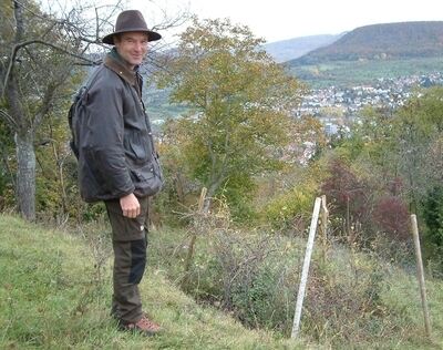 Revierförster Bernd Mair vor dem letzten verwilderten Weinstock am Georgenberg (aus der ersten Hälfte des 20. Jahrhunderts, entweder aus den Dreißiger-Jahren oder aus der Nachkriegszeit).