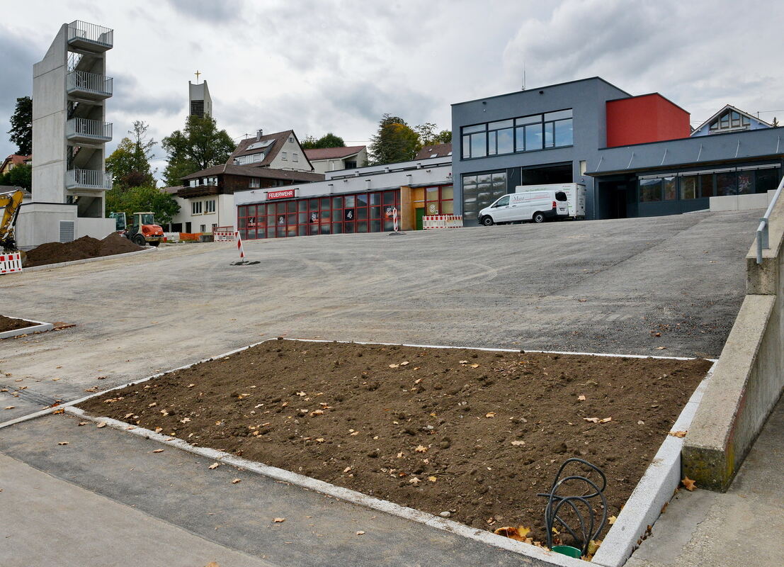 Der Anbau am Feuerwehrgerätehaus in der Schillerstraße (grau) steht und wird auch schon genutzt. FOTO: NIETHAMMER
