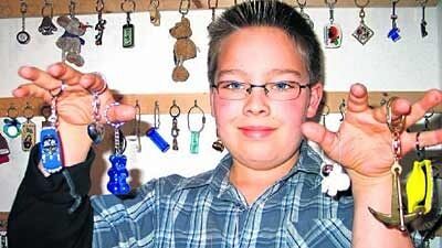 Lucas Sergent präsentiert seine Lieblingsstücke. Der Holzelfinger sammelt Schlüsselanhänger.