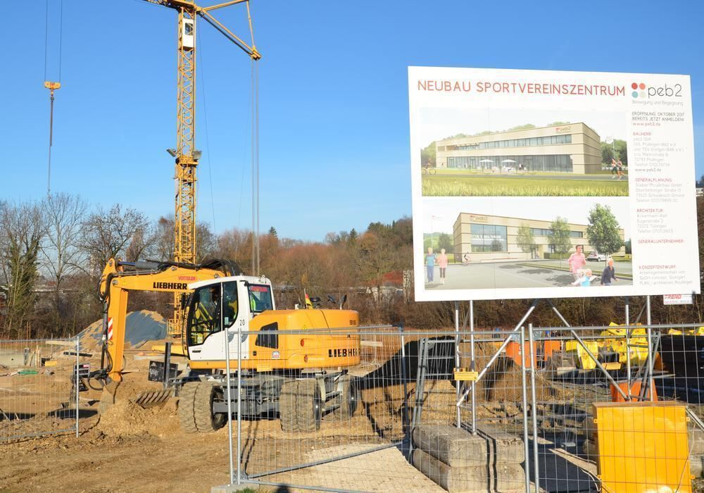 Die Bauarbeiten für das Sportvereinszentrum peb2 im Arbachtal haben begonnen. Spätestens im November 2017 soll es in Betrieb gehen. GEA-FOTO: SAUTTER