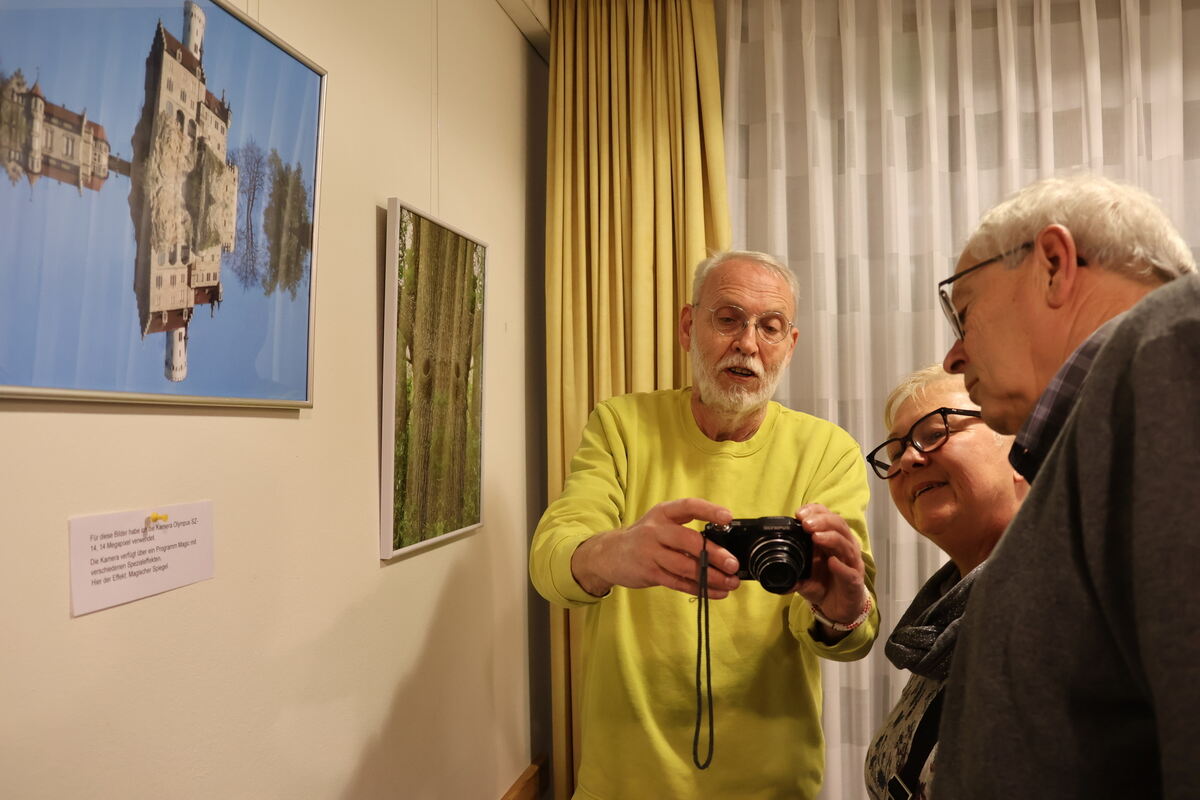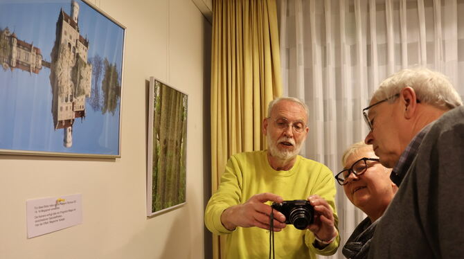 Rainer Hanko (links) zeigt Gästen, was seine kleine Kamera alles kann.