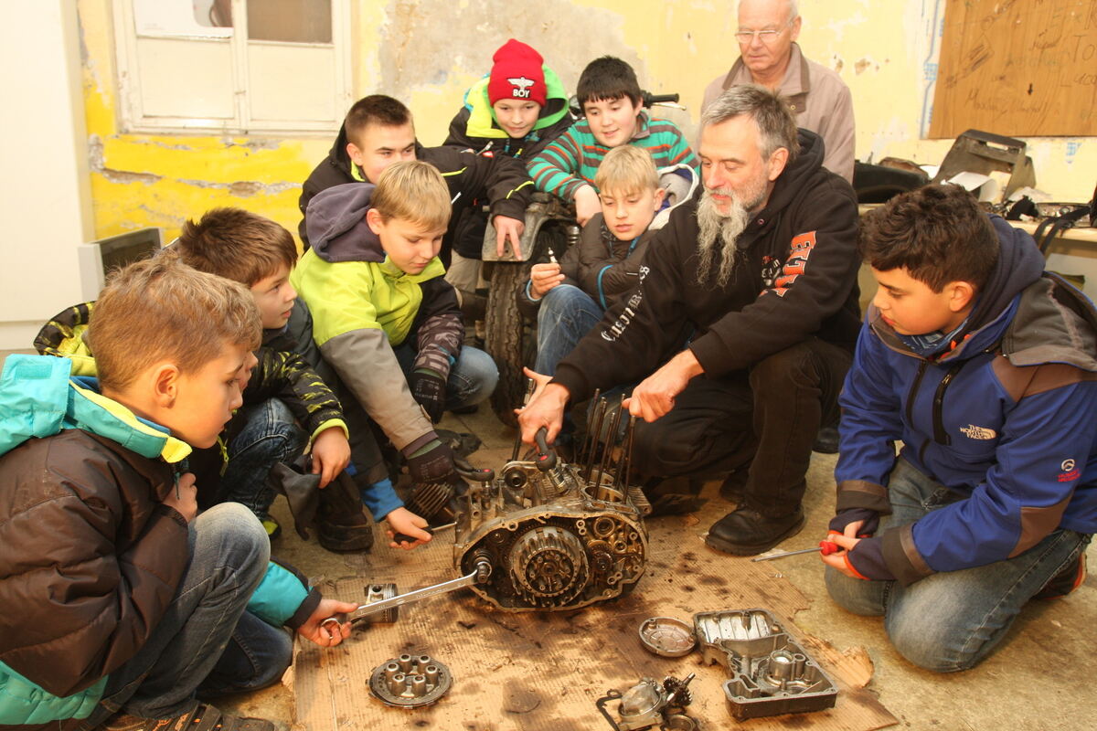 Dirk Hildebrandt (Zweiter von rechts) und seine Kids zerlegen in der neuen Schrauberwerkstatt einen alten Motor. FOTO: BAIER