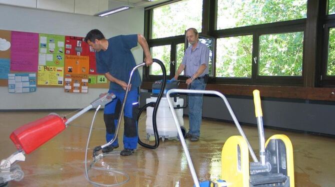 Die Pfullinger Schloss-Schule wird jetzt von Grund auf gereinigt: Hausmeister Stefan Kompter (rechts) und Reinigungskraft Demirci Kiziler beim Fußbodenputzen in einem der mehr als zwanzig Klassenzimmer.
