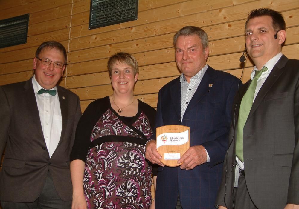 Sie freuen sich über eine starke Ortsgruppe (von links): Gauvorsitzender Thomas Keck, Tanja Waidmann vom Gesamtvorstand, der mit dem Ehrenschild ausgezeichnete Manfred Hinderer und der Vorsitzende in Holzelfingen, Frank Hummel. FOTO: KABLAOUI