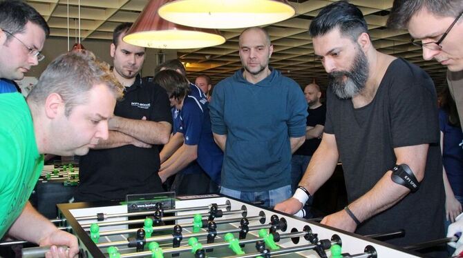 Das Weihnachtsturnier des Tischfußballclub Reutlingen, ausgetragen im Billardsportcenter in Pfullingen, war mit fünfzig Startern sehr gut besetzt. FOTO: LEIPPERT