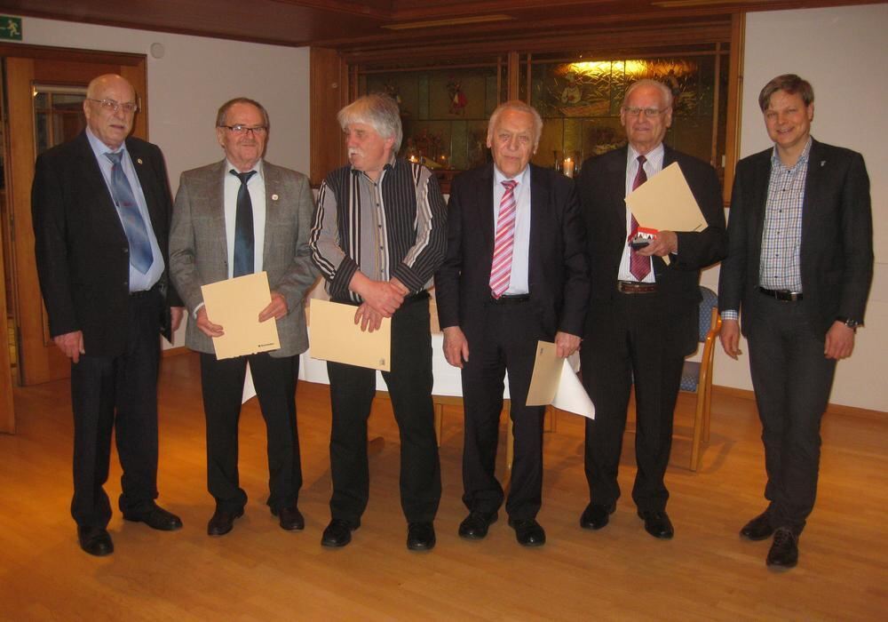 Der Vorsitzende der »Echazbuben« Helmut Stocker (von links) ehrt die Jubilare Paul Stooß, Hermann Martinitz, Heini Nicklas und Jakob Buck. Lichtensteins Bürgermeister Peter Nußbaum gratuliert. FOTO: PR