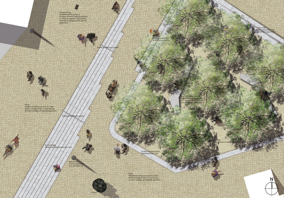 Während der Entwurf aus Berlin hier einen »introvertierten Kirchgarten« vorsah, will das Sieger-Büro den Platz mehr als eine Art Bühne gestalten, ihn zum parkähnlichen Kirchvorplatz machen. Sitzstufen mit zwei barrierefreien Rampen ermöglichten einen ungezwungenen Aufenthalt. Dort könne sich der Fußgänger vom bunten Treiben auf dem tiefer gelegenen Marktplatz zurückziehen. Von der Marktstraße werde der Kirchenhain durch eine lockere Baumreihe abgeschirmt.