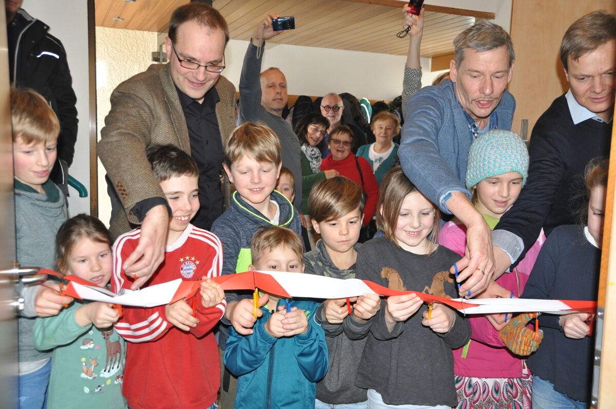 Den Weg ins Lädle freigemacht haben (von links) Sebastian Schmauder, Oliver Lacher, Peter Nußbaum und zahlreiche Kinder bei der Eröffnung. FOTO: BIMEK