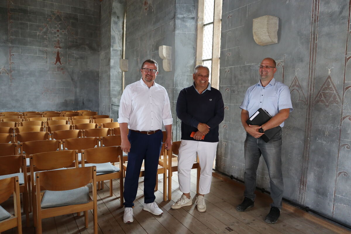 Der Pfullinger Bürgermeister Stefan Wörner (links) freut sich sehr über die Entwicklungen in der Klosterkirche und im Kulturhaus, die dank dem Architektem Thomas Bamberg (Mitte) und seinem Team Ende Juni eröffnet werden können. Besonerer Dank richtet Wörner auch an Oliver Polzin (rechts), Leiter des städtischen Gebäudemanagements.