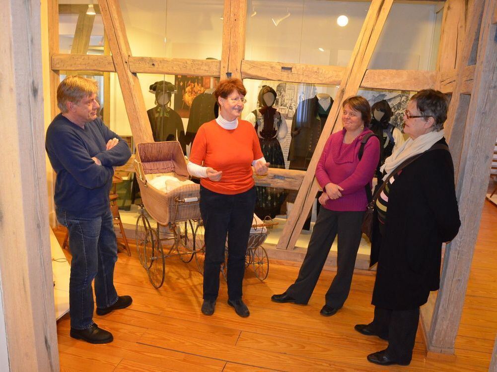 Dorothea Brenner (Zweite von links) in ihrem Element: Vor Kurzem empfing sie eine Delegation aus dem Freilichtmuseum Beuren. Werner Unseld, Eva Lauk und Christa Wölfel (rechts) ließen sich von der Leiterin des Pfullinger Trachtenmuseums Nachhilfe für die richtige Präsentation von Trachten geben. GEA-FOTO: SCHÖBEL