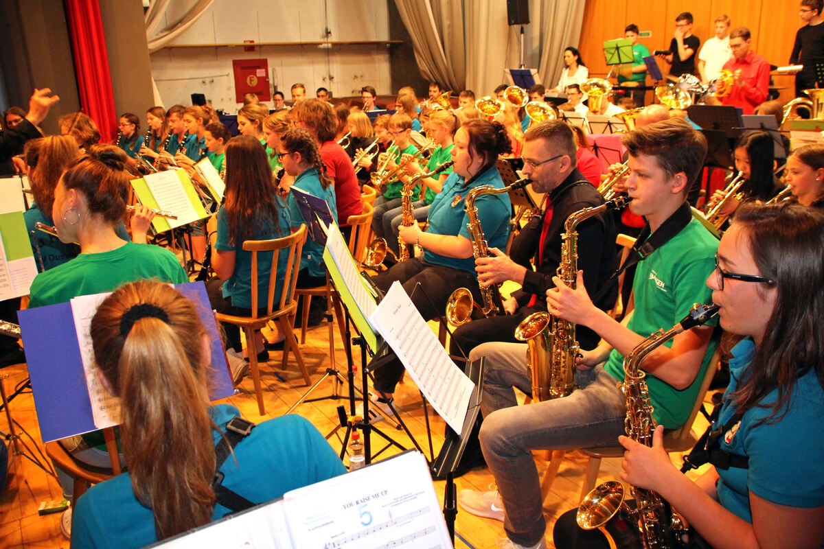Beim Konzert »Spätzle trifft Wattwurm« musizierten gleich mehrere Orchester und Ensembles auf der Bühne der HAP-Grieshaber-Halle. FOTO: LEIPPERT
