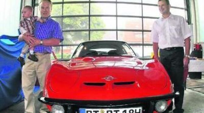 Der Wettsieger, sein Enkel und der Bürgermeister: Richard Tröster (links) und Helmut Knorr rahmen den Opel GT ein.