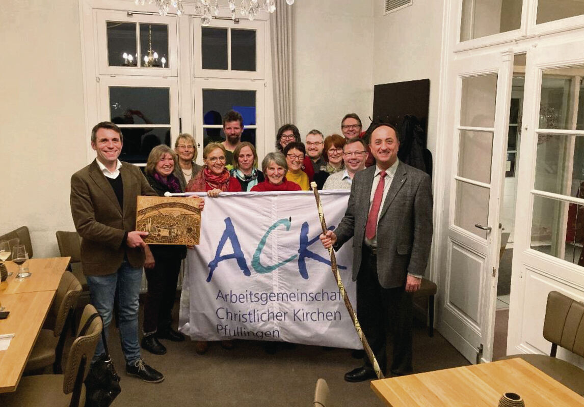 PFULLINGEN. Pfarrer Benjamin Lindner löst Dekan Hermann Friedl als Sprecher des Arbeitskreises Christlicher Kirchen (ACK) Pfullingen ab. Die Insignien des Vorsitzes – der Hirtenstab, ein Kirchenbild des Pfullinger Künstlers Horst Deiss und das ACK-Banner – wurden turnusgemäß an den evangelischen Pfarrer Benjamin Lindner übergeben. Der Stabwechsel wurde bei einem gemeinsamen Abendessen des ACK im Restaurant »Alter Bahnhof« in Pfullingen vollzogen.