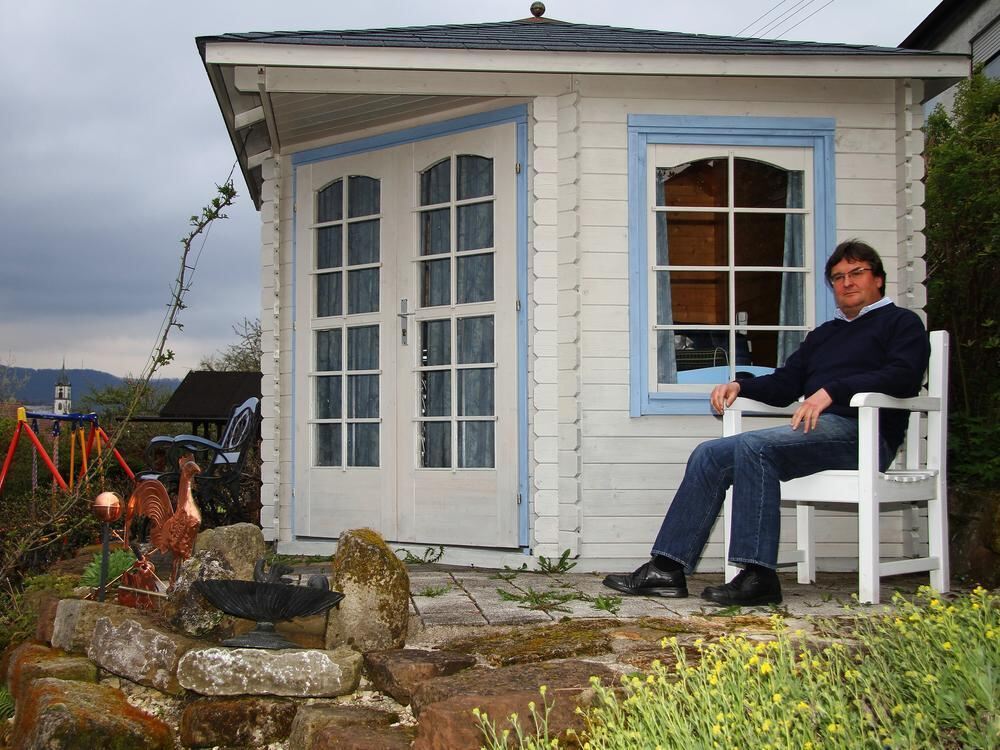 Richard Leuze an einem seiner Lieblingsplätze im Garten seines Hauses im Drosselweg, in dem er leidenschaftlich gräbt und werkelt. Das Häuschen hat er mit seinen Buben selbst gebaut, als diese noch »kleiner« waren.