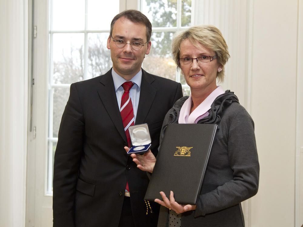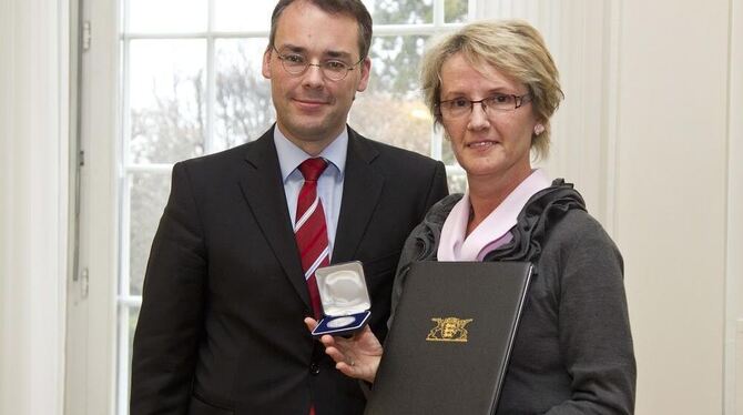 Minister Peter Friedrich ehrt Birgit Marlene Hartwig aus Münsingen. Foto: pr