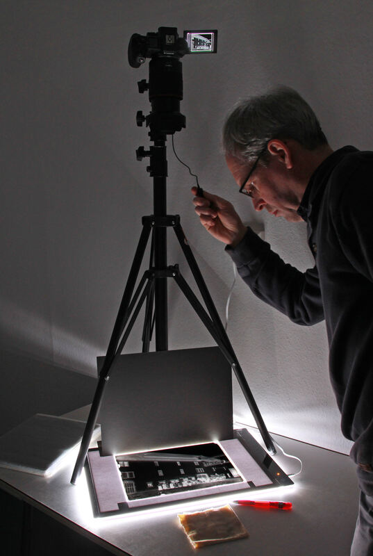 Steffen Burgemeister fotografiert eine Negativ-Glasplatte ab, um das Foto digital speichern und bearbeiten zu können.
