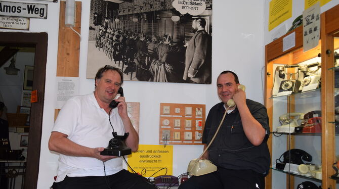 Klein ist der Raum im Eninger Heimatmuseum, in dem jährlich eine neue Sonderschau zu sehen ist. Groß die Erzählungen und Anekdoten, die Frank Ausmeier – Eninger mit Begeisterung für Geschichte – und sein Arbeitskollege Jürgen Schauer aus Ammerbuch auf Lager haben. Beide teilen sie eine Sammelleidenschaft. In der von ihnen innerhalb nur eines Monats konzipierten Schau stehen daher auch viele Stücke aus ihrem eigenen Fundus. Das Älteste aber ist eine Leihgabe: ein Fernsprechapparat OB5 aus dem Jahr 1905, der heute einen enormen Sammlerwert hat.
