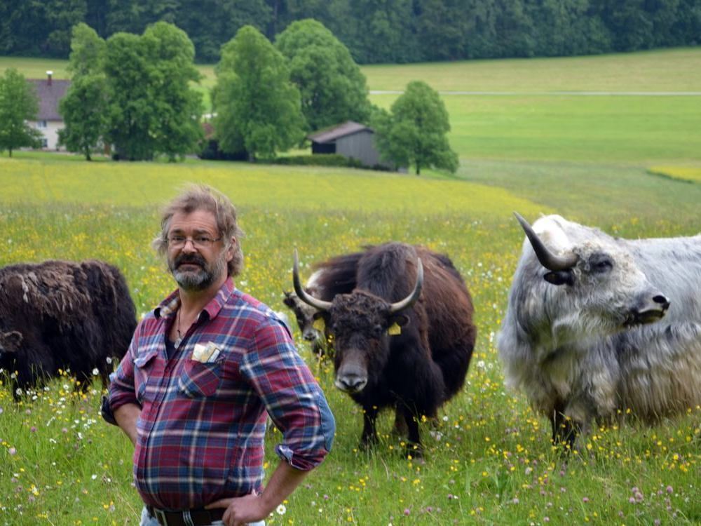 Charakterköpfe: Gerold Vöhringer und seine Yaks auf dem Göllesberg.