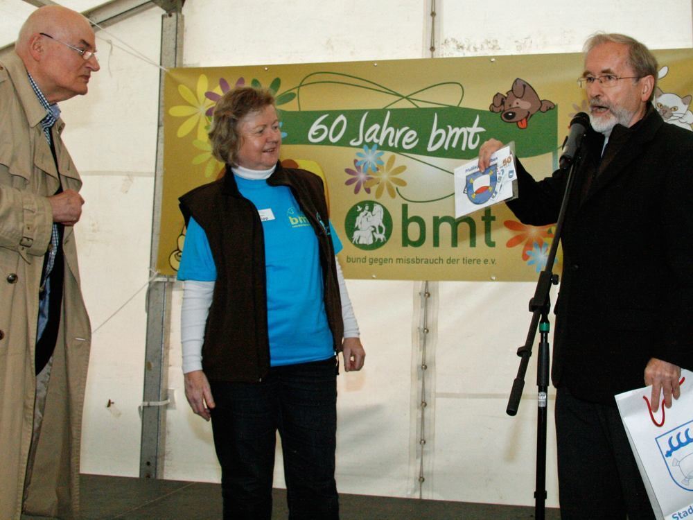 Bürgermeister Rudolf Heß (rechts) überreicht der Bmt-Bundesvorsitzenden Petra Zipp und Schatzmeister Bernd Stephan Geld für die notwendige Tierschutzarbeit. FOTO: LEIPPERT
