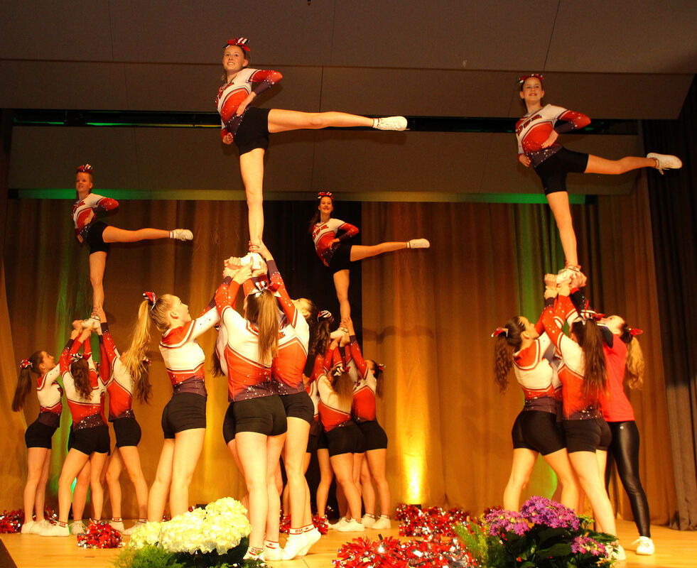 Die TSC Dancing Shoes ließen das Auditorium nur so staunen, als sie hallenhohe Menschen-Pyramiden bauten, dabei ein strahlendes Lächeln zeigten und sich ohne Scheu auch aus vier Metern Höhe in die Arme der Gruppe fallen ließen.