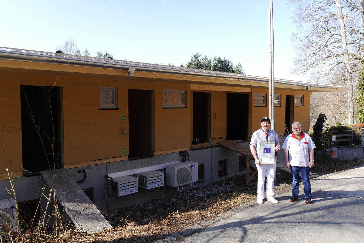 Jochen Etter berichtet ihr bei der Übergabe der LEADER-Erläuterungstafel über den Fortschritt der Umbauarbeiten. »Ich gehe davon aus, dass in etwa zwei bis drei Monaten alle Arbeiten abgeschlossen sein werden. Momentan fehlen noch der Umgang, also der Balkon am Anbau, die Verkleidung und die Einrichtung des Anbaus. Mit dem Ablauf der Modernisierung sind wir sehr zufrieden und hoffen, unsere Gastronomie bald wieder öffnen und die Neuerungen im Betrieb auch nutzen zu können«.