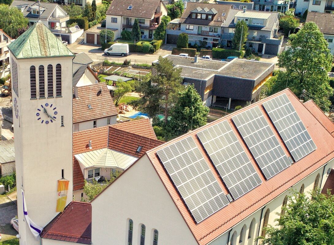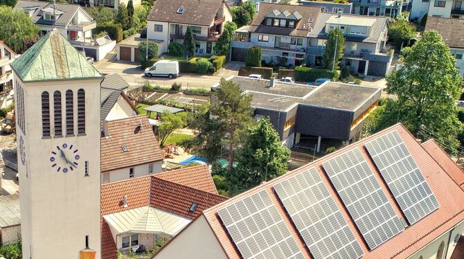 Die evangelische Kirche in Eningen mit Fotovoltaik-Anlage auf dem Dach.