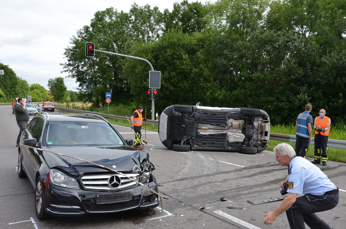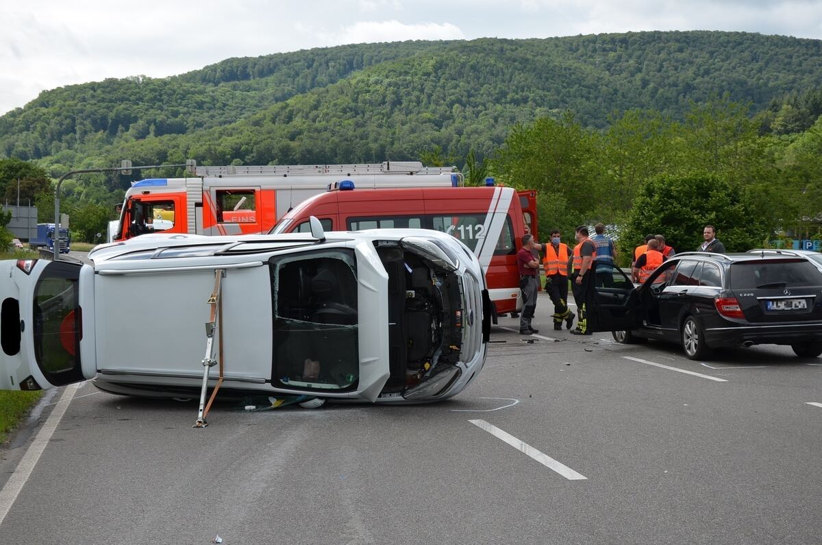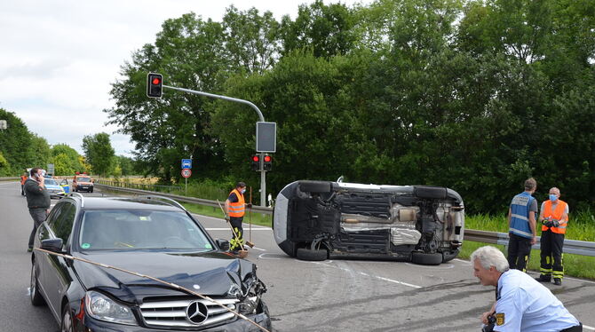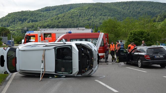 PFULLINGEN. Gegen 9.30 ist es auf der B312 zwischen Pfullingen und Unterhausen zu einem Unfall mit zwei beteiligten Fahrzeugen gekommen. Eine 24 Jahre alte Frau wollte mit ihrem Ford von der Klosterstraße kommend nach links in Richtung Ursulabergtunnel auf die B312 einbiegen. Der aus dem Tunnel in Richtung Unterhausen kommende 44 Jahre alte Lenker eines Mercedes konnte nicht mehr rechtzeitig bremsen und kollidierte mit dem Ford, der dadurch umkippte.