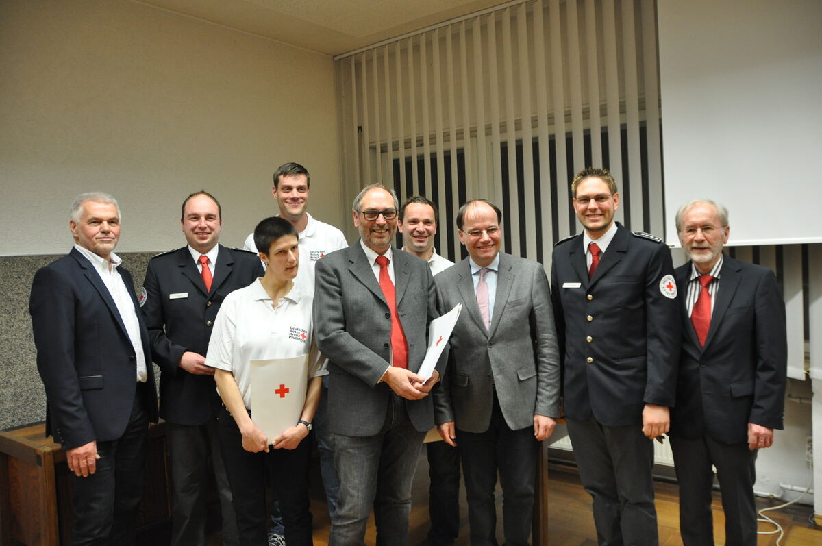 Im Mittelpunkt der Geehrten und Ehrenden: DRK-Vorsitzender Hubert Gulde (Fünfter von links). Er ist seit 40 Jahren dabei. FOTO: MEK