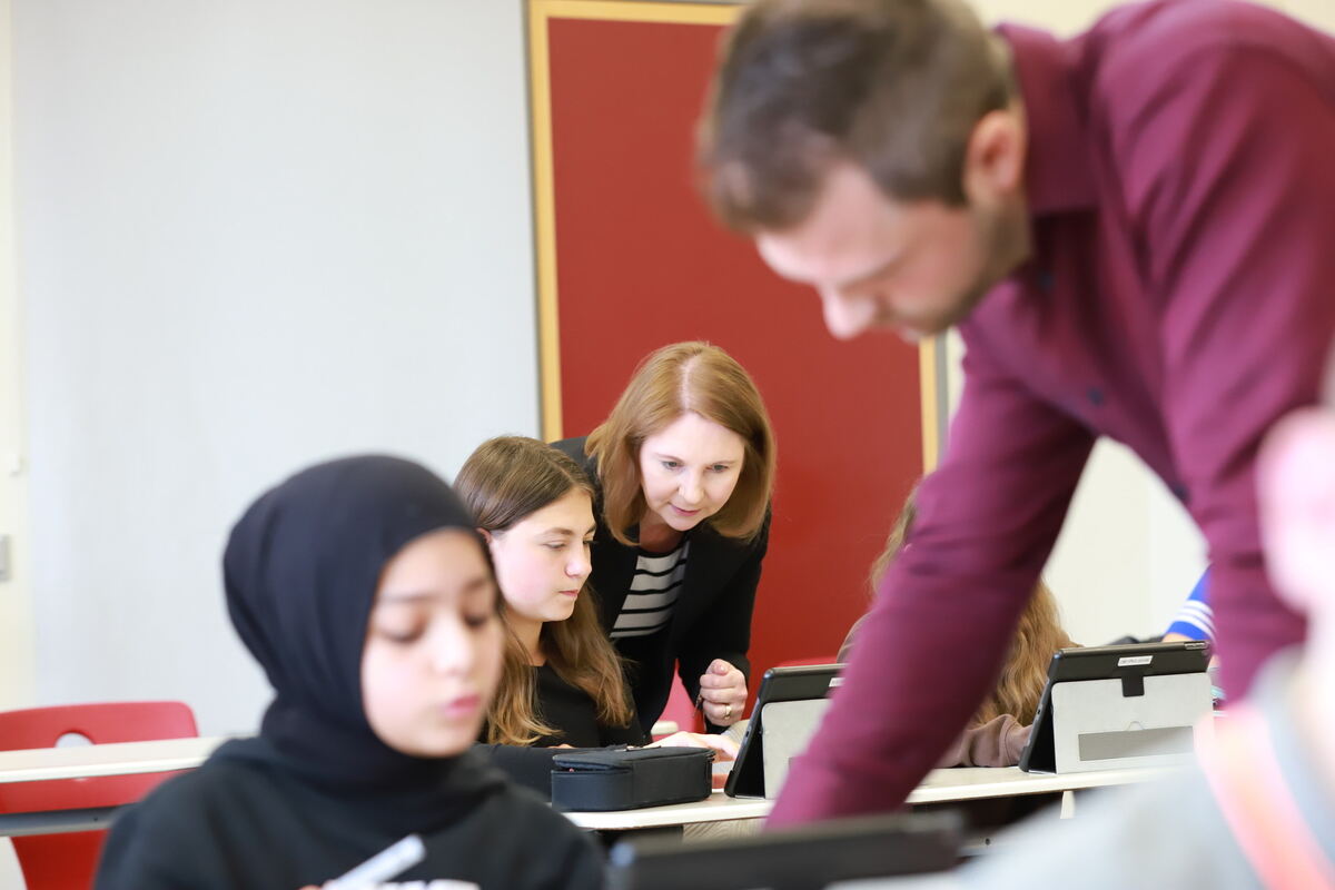 Staatssekretärin Sandra Boser guckt im Unterricht Schülerinnen der 6a im Fach BNT (Biologie, Natur und Technik) über die Schulter. Lehrer David Heinzelmann hilft einer Schülerin.