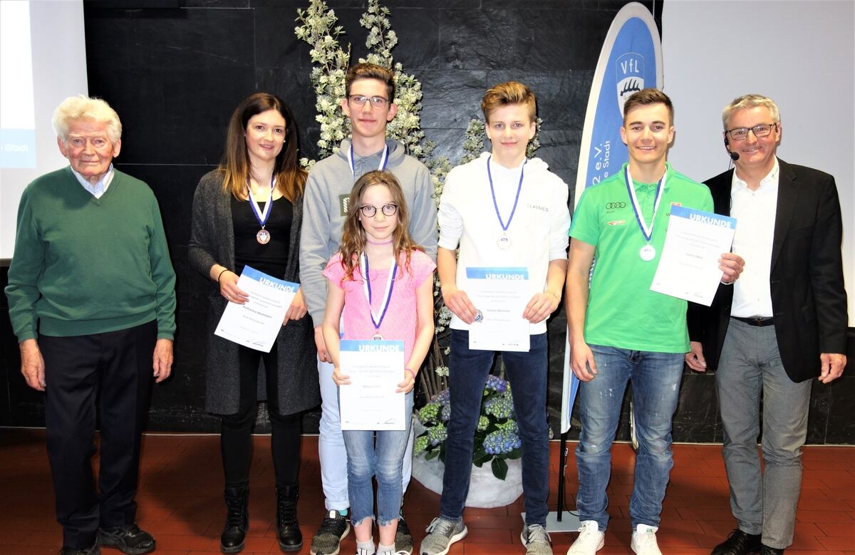 Willy Wörner (von links) wurde für 70 Jahre Mitgliedschaft geehrt. Für ihre sportlichen Leistungen ausgezeichnet wurden Katharina Wohlfahrt, Finn Stütz, davor Milena Hils, Simon Wenzler und Louis Uber. Mit ihnen freut sich der Vorsitzende Sven Schauenburg. FOTO: BÖHM