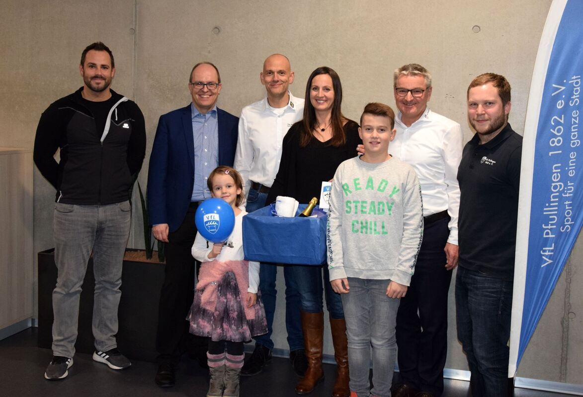 PFULLINGEN. Feierlich empfingen Vereins-Präsident Sven Schauenburg und Geschäftsstellen-Leiter Tobias Stoll jetzt das 4 000. Mitglied im Sportvereinszentrum peb2: Christine Militzer. Diese kam mit der ganzen Familie im Schlepptau. Ihr Ehemann Markus trat als 3 999. Mitglied wie sie im vergangenen Dezember dem Verein bei, die Kinder Lina und Tom sind bereits seit 2013 und 2016 dabei. Als Präsent gab’s einen freien Monat im peb2 für Christine Militzer und ein beitragsfreies Jahr im VfL für die ganze Familie.