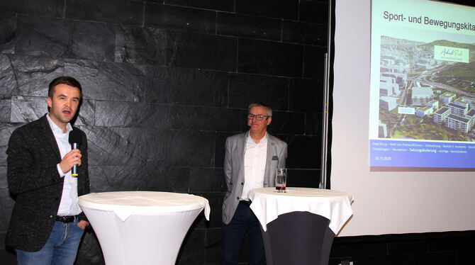 Steffen Menacher, Schöller SI Immobilien Reutlingen, (links) und VfL-Präsident Sven Schauenburg stellten den Mitgliedern ihre Vision einer Kita mit sport- und bewegungserzieherischem Schwerpunkt im Wohnquartier »Arbachpark« vor. FOTO: LEIPPERT