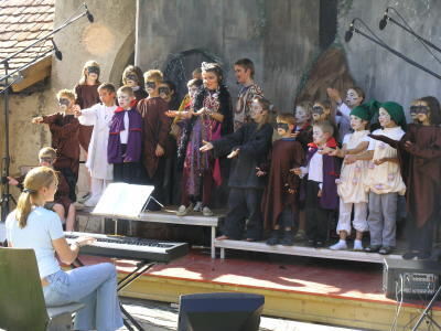 Der Chor der Vampire mit Wackelzahn und seine Leiterin Christina Stanecker (links) beim Auftritt im Klostergarten.