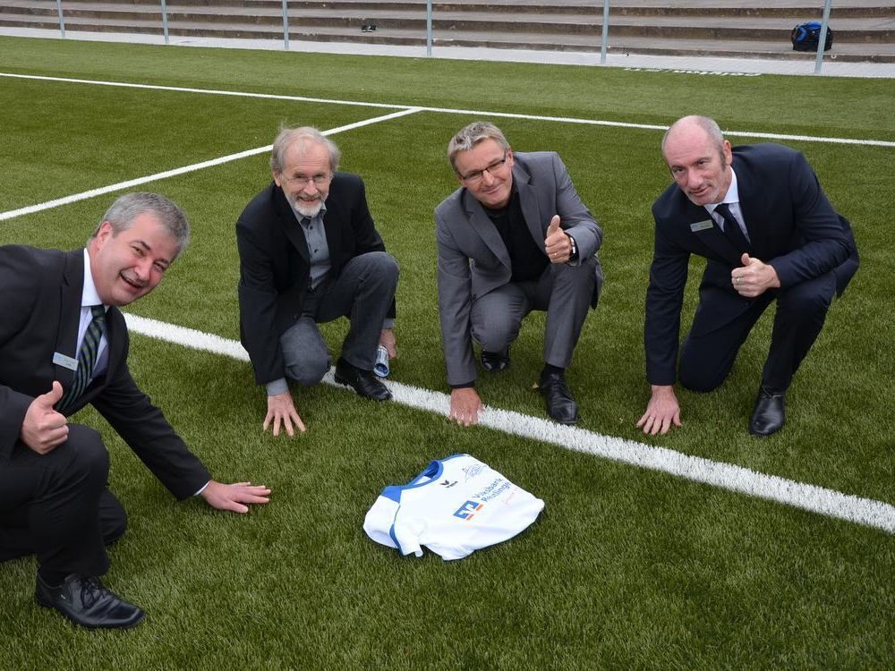 Getestet und für gut befunden: Manfred Link von der Volksbank Reutlingen, Bürgermeister Rudolf Heß, VfL-Präsident Sven Schauenburg und Thomas Allraum (von links) von der Volksbank Pfullingen sind zufrieden mit dem Kunstrasenplatz auf dem VfL-Sportgelände. FOTO: HOMOLKA