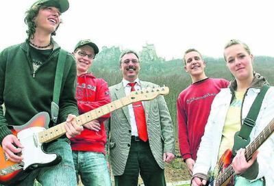 Vertreter der Nachwuchsgruppen präsentieren sich vor Schloss Lichtenstein: Von links: Hannes Schneider (Scarlet Drawl), Benjamin Weißer und Markus Schmich (beide Sunrize), Marie-Luise Eitel (Out of Control) Mitte: Thomas Epple, Vorsitzender TuS Honau.