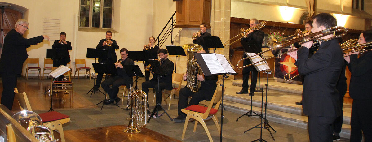 Das Konzert der zwölf Musiker des Schwäbischen Posaunendienstes unter Leitung von Landesposaunenwart Hans-Ulrich Nonnenmann kam beim Publikum in der Pfullinger Martinskirche sehr gut an. FOTO: LEIPPERT